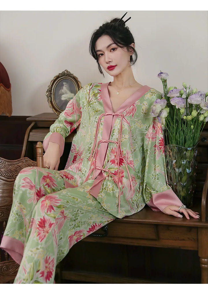 Chinese Style Button Satin Shirt & Trousers Pajama Set