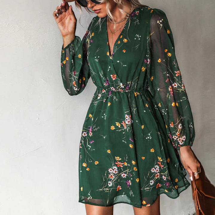 Floral Chiffon Long Sleeve V-neck Mini Dress