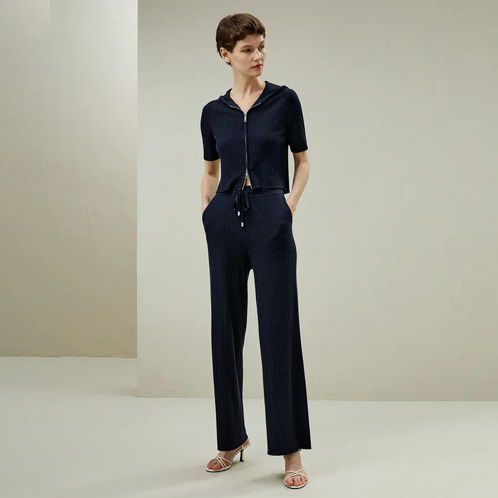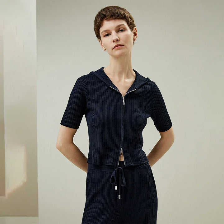 Silk-Wool Knit Zipper-Up Short Sleeve Hoodie Sweatshirt