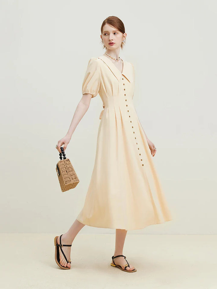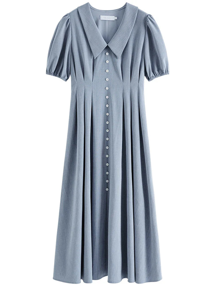 Solid Pleated Polo Neck Puff Sleeve Dress