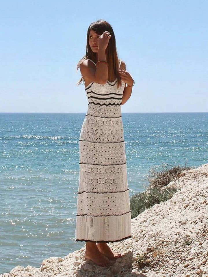 Striped Knit Cut Out Long Halter Beach Dress Swimsuit Cover Up