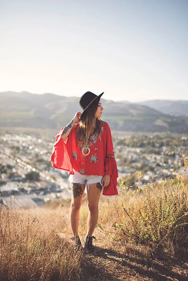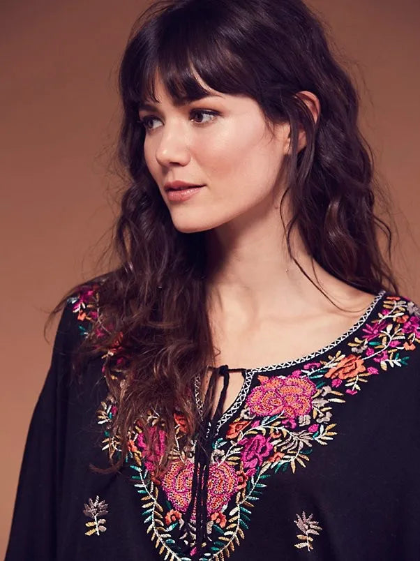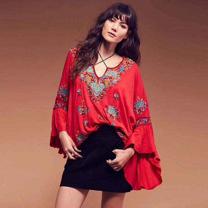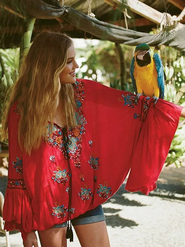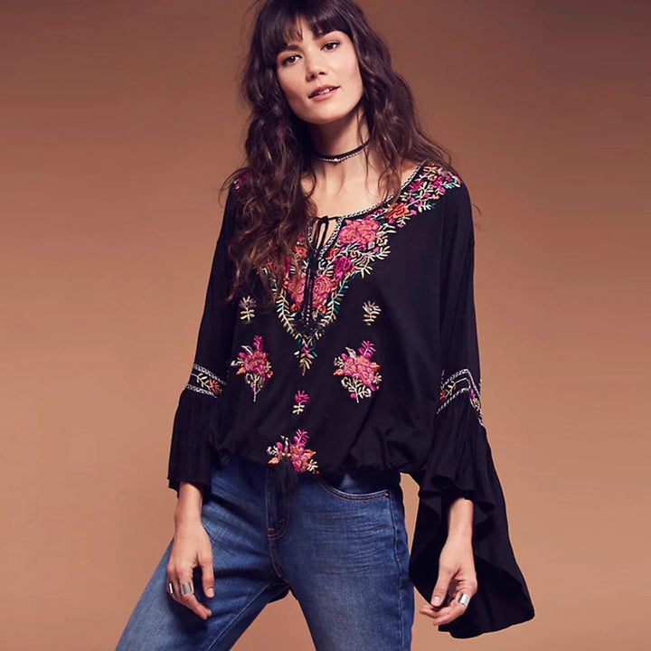 Vintage Embroidery Floral Flare Sleeve Boho Shirt Top
